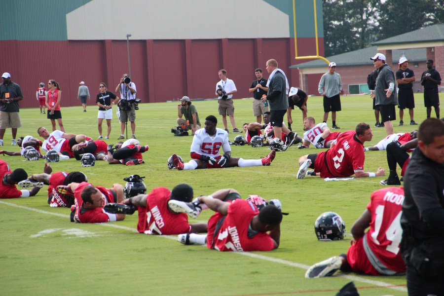 Atlanta_Falcons_players_warm_up_at_training_camp_July_26,_2013